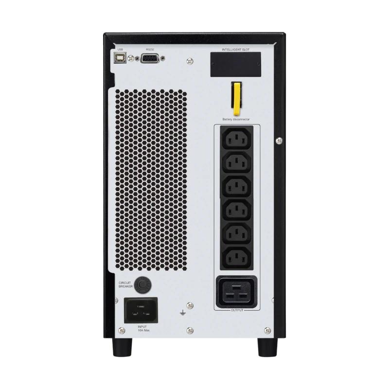 | Características | Principal – Tiempo de funcionamiento de la carga: 4min 24s – Max. capacidad utilizada: 100 % – Voltaje de entrada: 230 V – Tipo de producto o componente: Sistema de alimentación ininterrumpida (UPS) – Voltaje de salida: 230 V – Potencia nominal en W: 2400 W – Potencia nominal en VA: 3000 VA – Tipo de conexión de entrada: CEI 60320 C20 – Tipo de conexión de salida: 6IEC 60320 C13 1IEC 60320 C19 – Longitud de cable: 1,5 m – Número de cables: 1 Baterías y tiempo de autonomía – Tipo de batería: Batería de plomo y ácido – Voltaje de batería: 72V – Módulos de baterías incluidos: 0 – Ranuras de la batería vacías: 0 – Tiempo típico de recarga: 4 H – Vida de la batería: 3…5 años – Suministro de carga de baterías (vatios): 60 W nominal Descripción física – Color: Negro – tipo de cable: RAL 7010) – Altura: 33,6 cm – Anchura: 19 cm – Profundidad: 42,5 cm – Peso del producto: 26,8 kg – Ubicación de montaje: Frontal – Tipo de montaje: En cordón de luminaria – USB compatible: Sí – Posición de montaje: Vertical Entrada – Barras de separación: 110…285 V hardware 160…280 V carga completa – Frecuencia de red: 40-70 Hz autodetección Salida – Potencia máxima configurable en VA: 3000 VA – Potencia máxima configurable (vatios): 2400 W – Frecuencia de salida: 50/60 Hz +/- 3 Hz sincronizado para principales – Distorsión armónica: 3 % – Topología: Online de doble conversión – Tipo de forma de onda: Onda senoidal – La ranura para destornillador: 88 % – tipo de cable: carga completa) – Información adicional: Configurable para 220:tensión nominal de salida 230 o 240 – Tipo de derivación: Derivación interna (automática y manual) – Factor de cresta: 3:1 Conformidad – Certificaciones de producto CE UKCA Generador TISI – Normas EN/IEC 62040-1:2019/A11:2021 EN/IEC 62040-2:2006/AC:2006 EN/IEC 62040-2:2018 Medioambiental – Temperatura ambiente de operación: 0…40 °C – Humedad relativa: 0…95 % sin condensación – Altitud de operación: 0…3000 m – Temperatura ambiente de almacenamiento: -20…50 °C – Humedad Relativa de Almacenamiento: 0…95 % sin condensación – Altitud de almacenamiento: 0…15000 m – Nivel acústico: 50 dBA – Disipación térmica online: 910 Btu/h – Grado de protección IP: IP20 Comunicaciones y Gestión – Alarma: Alarma con batería: alarma distintiva de batería baja: alarma de tono continuo de sobrecarga – Ranuras libres: 1 – Función de alarma: Consola de estado y control lcd multifunción Protección y Filtro contra Picos de Voltaje – Medición de Energía de Picos de Voltaje (Julios): 600 J |