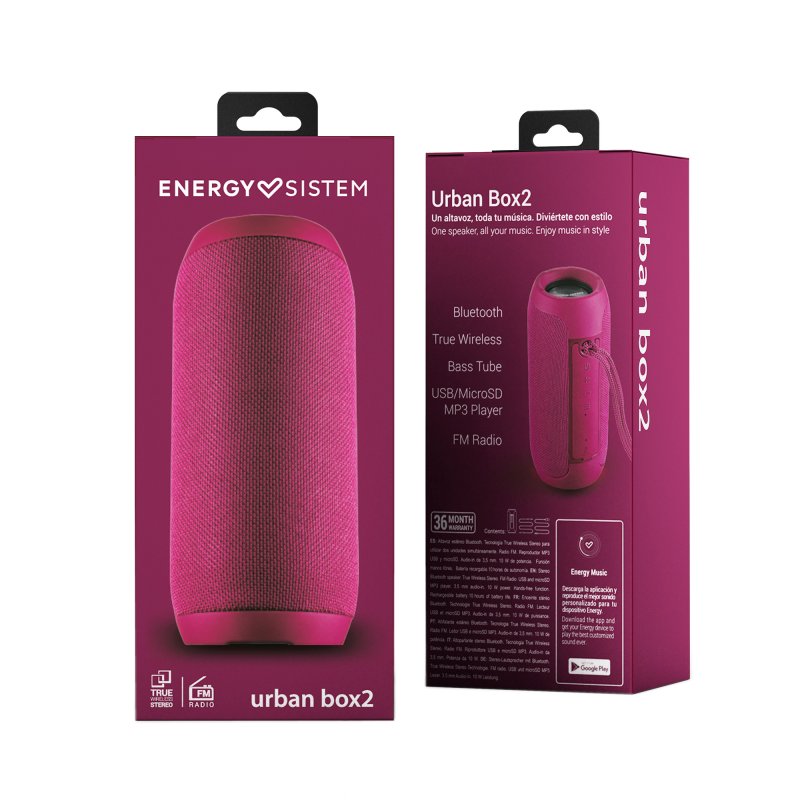 | Otras características | Audio – Sistema: 2.0 – Potencia: 10 W – Altavoces: 2 de rango completo de 40 mm – Radiador de graves: doble membrana – Respuesta en frecuencia: 100 Hz ~ 18 KHz – Relación Señal / Ruido: > 60 dB TWS compatible con – Urban Box 2 Entrada de audio – Entrada de audio auxiliar mini jack estéreo de 3,5 mm Radio FM – Frecuencia de trabajo: 87.5 ~ 108 MHz – Función de búsqueda automática de emisoras Reproducción microSD y USB – Decodificador microSD y USB: reproduce archivos MP3 desde memorias externas de hasta 64 GB de capacidad en formato FAT / FAT32. Batería – Capacidad: 1200 mAh – Tipo: polímero de litio – Autonomía: 12 horas* – Conector de carga: microUSB – Tiempo de carga: 3 horas Dimensiones y peso – 68,8 x 68,8 x 160 mm – 450 g Contenido – Urban Box 2 – Cable de audio: 3,5 mm – Cable USB – Guía rápida |