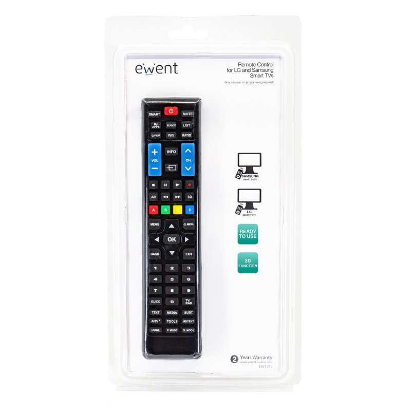 Controle su televisor LG y Samsung (Smart) con el mando a distancia EW1575. El mando funciona directamente, sin necesidad de programarlo. El EW1575 incluye todas las funciones del mando a distancia original de su televisor LG y Samsung. Esto quiere decir que puede utilizar las funcionalidades de 3D y de televisión inteligente de su televisor.