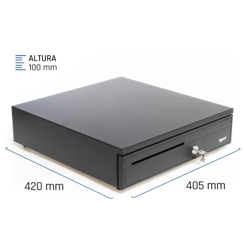 | Características | – Ranura de acceso frontal – Rodillos de cojinete de bolas de alta resistencia – Cerradura tres posiciones de bloqueo – Apertura manual o automática – Compartimentos: 5 billetes y 5 monedas – Interfaz RJ11 (alimentación 12V) – Incluye cable RJ11 de 1 metro de longitud – Dimensiones: 420 x 405 x 100 mm – Peso: 4,5 kg – Color: Negro |