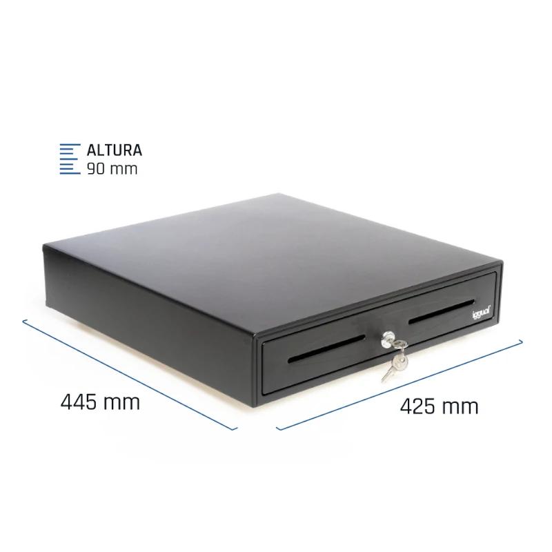 | Especificaciones | – Ranura de acceso frontal – Rodillos de cojinete de bolas de alta resistencia – Cerradura tres posiciones de bloqueo – Apertura manual o automática – Compartimentos: 5 billetes y 8 monedas – Interfaz RJ11 (alimentación 12V) – Incluye cable RJ11 de 1 metro de longitud – Dimensiones: 445 x 425 x 90 mm – Peso: 5,7 kg – Color: Negro |