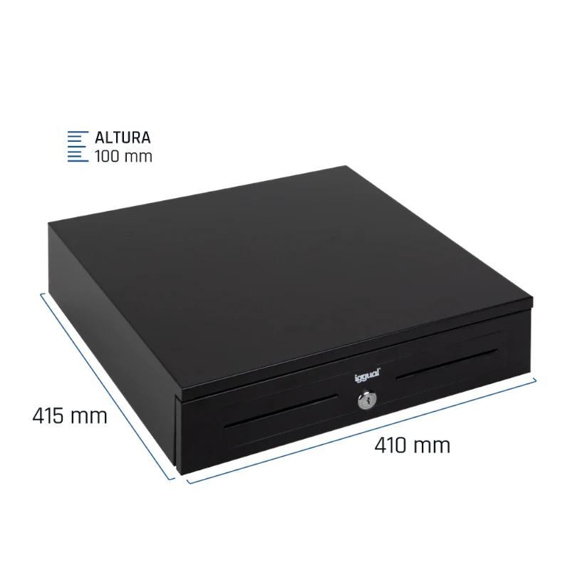 | Características | – Ultra resistente – Chasis y carcasa de acero galvanizado «heavy duty» – Diseñado para resistir grandes cargas de trabajo – Ranuras de acceso frontales – Rodillos de cojinete de bolas de alta resistencia – Cerradura tres posiciones de bloqueo – Apertura manual o automática – Compartimentos: 5 billetes y 8 monedas (ajustables y extraíbles) – Interfaz RJ11 (alimentación 12V) – Incluye cable RJ11 de 1 metro de longitud – Dimensiones: 415 x 410 x 100 mm – Peso: 7,2 kg – Color: negro |