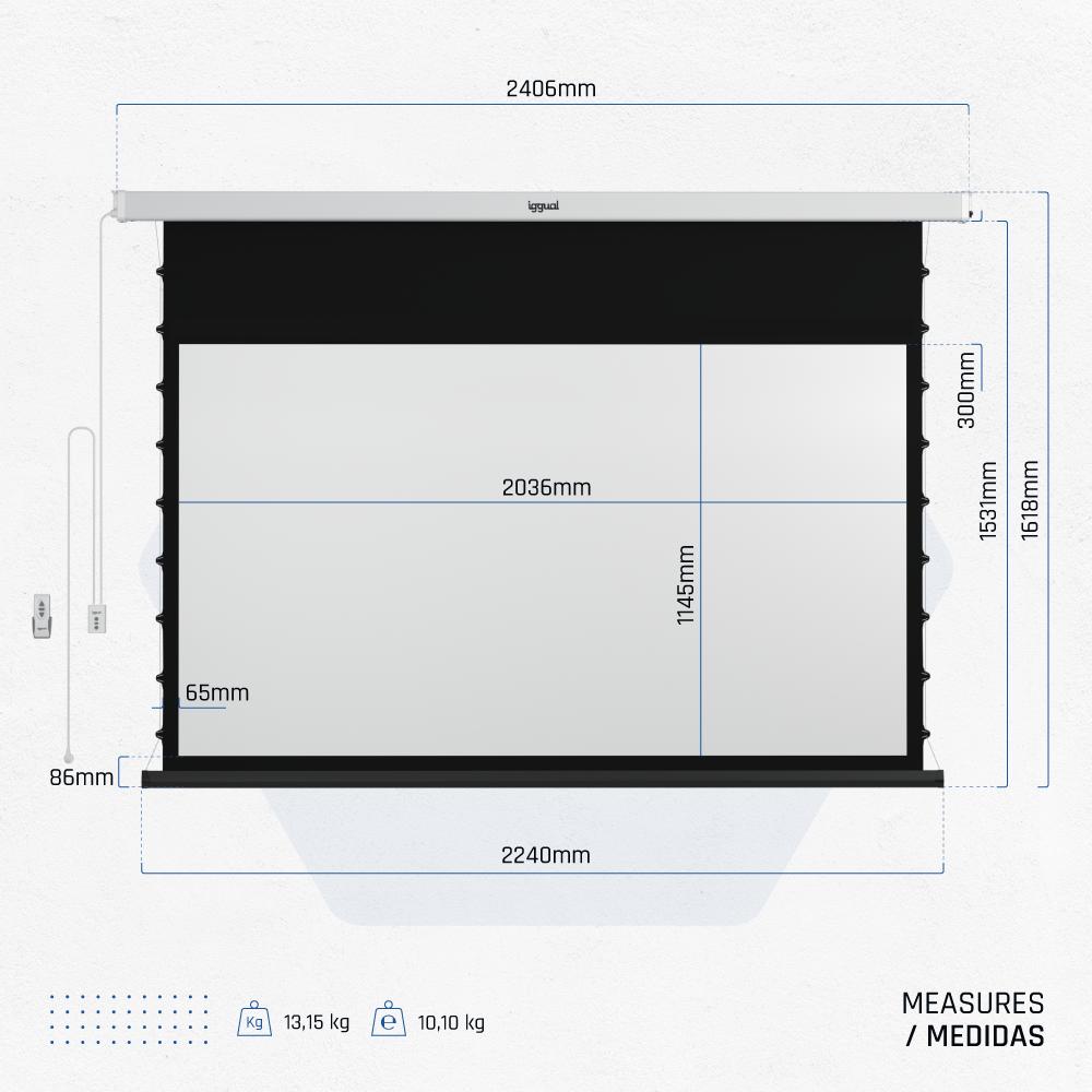 | Características | – Formato 16:9 – Área visible de 92″ (203 x 114 cm) – Bordes negros laterales de 6,5 cm – Carcasa blanca y a prueba de polvo – Se puede instalar tanto en techo como en pared – Tela compuesta de 4 capas – Parte trasera negra mate para mayor refracción de la luz – Sistema de tensión lateral – Muy buena planeidad libre de arrugas gracias a los cables de tensión – Voltaje 230 VAC- Frecuencia 50Hz – Salida del cable de alimentación a la izquierda / derecha (a elegir por el usuario) – Incluye control de pared y mando remoto infrarrojo (IR) – Factor de ganancia de 1.0, ideal para cine en casa y presentaciones – La caída de la pantalla puede ser frenada en cualquier punto, por lo que se puede ajustar la longitud de la pantalla a cualquier formato – La barra inferior queda al ras con la carcasa – Ideal para cualquier tipo de proyector, SVGA, XGA, 3D, HD, Full HD, 4K y 8K – Alta calidad y durabilidad |