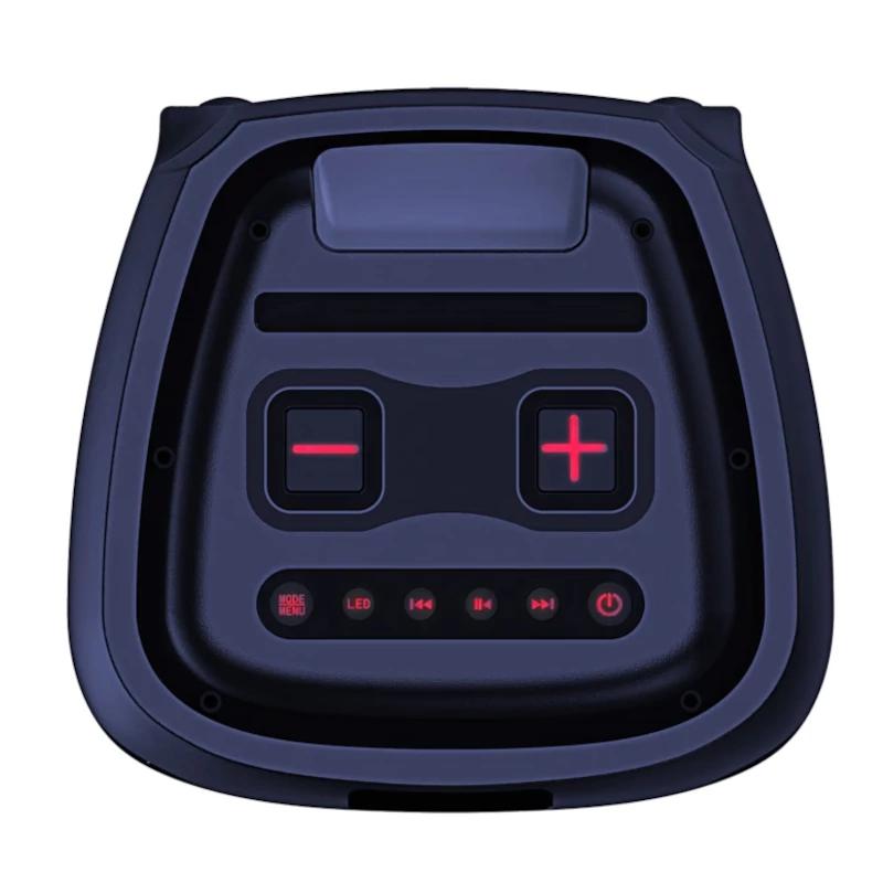 | Características | – Potencia Nominal / Max: 40W / 160W – RMS: 20W – Speaker: 2X6″ wofeer and 1.5″ tweeter – Batería: 4 x 2000mAh – Funciones: USB / TF / Remote control / True Wireless / TWS – Luz: Multicolor LED luces – Cubierta: Red de acero – Otros: 1 asa Dimensiones – 240 x 230 x 555 mm |
