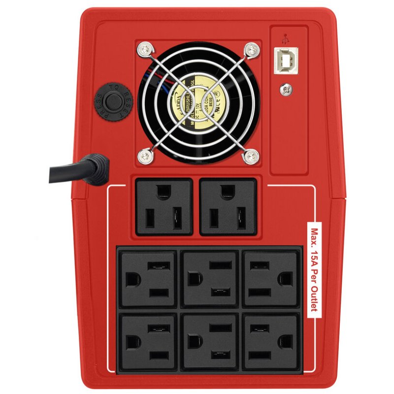 | Salida | – Tensión nominal: 120 V AC – Precisión tensión (modo batería): ±10% – Potencia (VA): 2000 – Forma de onda (modo batería): Pseudosenoidal – Frecuencia: 50 / 60 Hz – Tiempo de transferencia: 2-6 ms Típico, 10 ms Máx. – Tipo de tomas: NEMA |