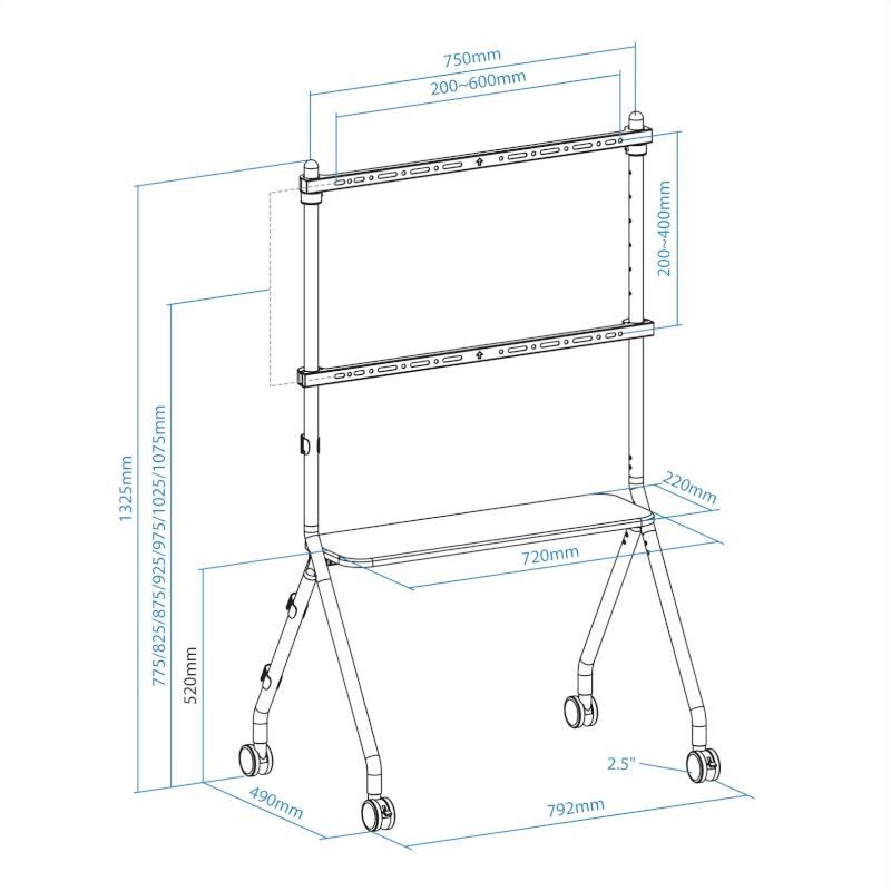 | Características | – Pantallas soportadas: 49″-80″ – Compatible con VESA: Máximo 600 x 400. Mínimo 200 x 200 – Peso soportado de pantalla: 50 kg – Rango de ajuste de altura del soporte: 775/825/875/925/975/1025/1075 mm – Ancho del soporte: 750 mm – Bandeja inferior multiusos – Medida de bandeja: Inferior 720 x 220 mm – Peso máximo de la bandeja: 5 Kg – Distancia entre ruedas: 792 x 490 mm – Ruedas con sistema de bloqueo – Ruedas de 60 mm – Sistema de organización de cables – Color: Blanco y Haya – Material: Estructura de acero y tablero de MDF Dimesniones y peso – Peso: 8,90 kg. – Medidas del embalaje: 863 x 266 x 138 mm |