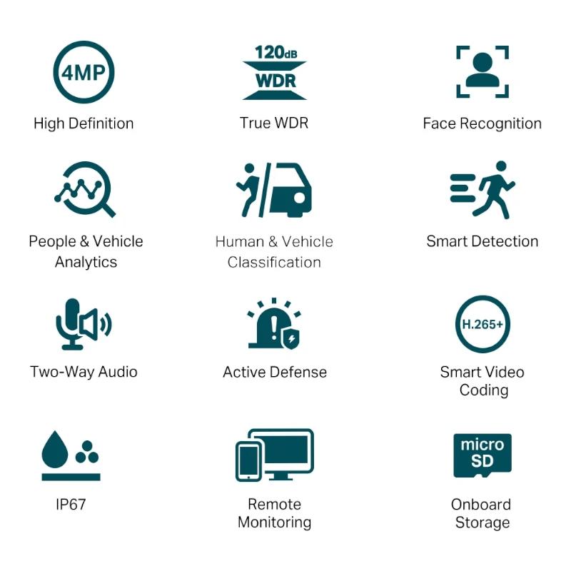| Características | Red – Protocolo: TCP/IP, UDP, ICMP, HTTP, HTTPS, DHCP, DNS, RTSP, NTP, UPnP UDP, SSL/TLS – ONVIF – API: Open Network Video Interface (Profile S) – Vista en vivo simultánea: 3 transmisiones principales y 3 subtransmisiones – Client: VIGI App, VIGI Security Manager, Web UI – Navegador web: Navegador web Google Chrome 57 y superior Firefox 52 y superior Safari 11 y superior Microsoft Edge 91 y superior – Nube – Seguridad: Protección por contraseña, cifrado HTTPS, filtro de direcciones IP, autenticación Digest Audio – Comunicación de Audio: Audio Bidireccional – Entrada de audio – Salida de Audio – Compresión de audio – Frecuencia de muestreo de audio: 8KHz – Filtrado de ruido ambiental – Velocidad de bits de audio: 64 Kbps (ley G.711) Alarma – Evento inteligente: Clasificación de personas y vehículos Detección de intrusión de área Detección de cruce de líneas Detección de personas Detección de vehículos Detección de entrada de región Detección de salida de región Detección de objetos abandonados Detección de eliminación de objetos Detección de merodeo Detección de cambios de escena – Evento Básico Detección de movimiento Detección de manipulación de vídeo Excepción (inicio de sesión ilegal) Detección de cambio de escena – Enlace de alarma Grabación de vídeo con tarjeta de memoria Mensaje push Advertencia sonora Luz blanca intermitente – Notificación de salida: mensaje push Alimentación – Fuente de alimentación: 12 V CC ± 5 %, máx. Enchufe de alimentación coaxial de 10,1 W y 5,5 mm. PoE: 802.3af/at, clase 0, máx. 11,5W Dimensiones – 102 × 236 × 99 mm Contiene – Cámara de red VIGI – Guía de inicio rápido – Accesorios para cables impermeables – Accesorios de montaje |