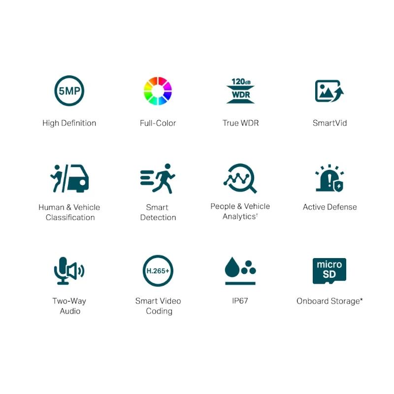 | Características | Red – Protocolo: TCP/IP, UDP, ICMP, HTTP, HTTPS, DHCP, DNS, RTSP, NTP, UPnP UDP, SSL/TLS – ONVIF – API: Open Network Video Interface (Profile S) – Vista en vivo simultánea 3 transmisiones principales y 3 subtransmisiones – Client: VIGI App, VIGI Security Manager, Web UI, VIGI VMS – Navegador web: Google Chrome® 57 and above Firefox® 52 and above Safari® 11 and above Microsoft® Edge 91 and above – Nube – Seguridad: Protección con contraseña, cifrado HTTPS, filtro de dirección IP, autenticación implícita Alarma y Gestión de Eventos – Evento inteligente Clasificación de personas y vehículos Detección de intrusiones Detección de cruce de líneas Región que ingresa a la detección Detección de salida de región Detección de objetos abandonados Detección de eliminación de objetos Detección de merodeo Marco inteligente Detección de personas Detección de vehículos – Evento Básico Detección de movimiento Detección de manipulación de vídeo Excepción (inicio de sesión ilegal) Detección de cambio de escena – Enlace de alarma Grabación de vídeo en tarjeta de memoria Envío de mensajes Advertencia audible Luz blanca intermitente – Notificación de salida: Mensaje push Alimentación – Fuente de alimentación 12V DC ± 5%, Max. 9.7 W, 5.5 mm Coaxial Power Plug PoE: 802.3af/at, class 0, Max. 10.7 W Dimensiones y peso – 74 × 184 × 74 mm – 0.525 Kg Contiene – Cámara de red VIGI – Guía de inicio rápido – Accesorios para cables impermeables – Accesorios de montaje |