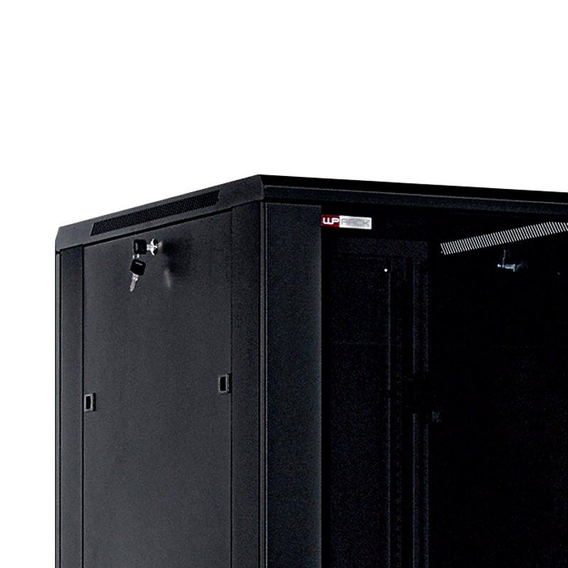 La puerta de cristal templado, el armazón de acero de 2 mm, los cierres (también en los paneles laterales desmontables), las 4 ruedas y las 4 patas de nivelación convierten esta serie en una solución sencilla y con todo lo necesario para su instalación.